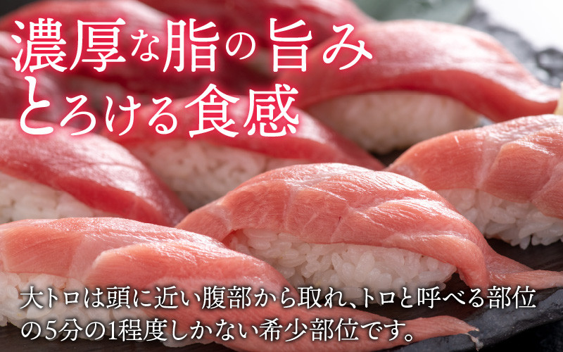 大トロは頭に近い腹部から取れ、トロと呼べる部位の5分の1程度しかない希少部位です。