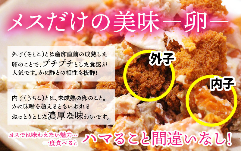 かに味噌を超えるといわれている赤くねっとりとした濃厚な「内子」と、プチプチとした「外子」の食感が口の中で絶妙にマッチ。