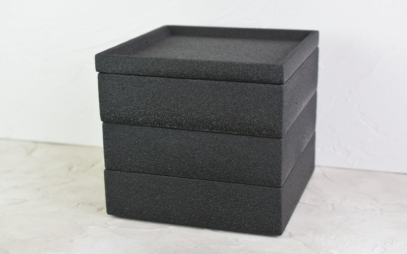 マットな色合いでザラザラとした陶器のような手触りの全く新しい越前漆器の3段重箱