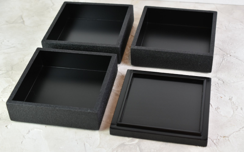 漆器は傷がつきやすいものというイメージがあり特別なときにしか使わないとのお声をいただきますが、重箱の外塗りに使用している独自開発の漆は表面にほんの少しの凹凸を施しているため擦れに強く傷がつきにくくなっています。