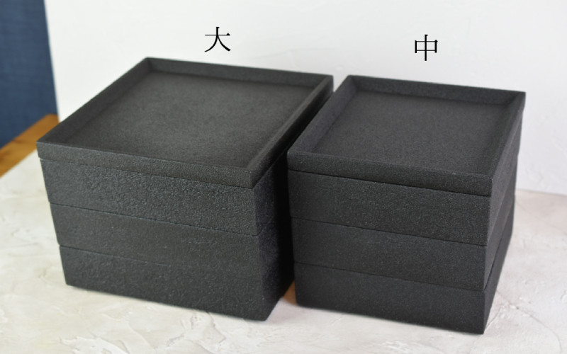 ザラザラとした手触りとマットな色合いが特徴のこれまでにない越前漆器の三段重箱(中)。