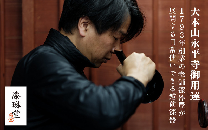 1793年(寛政5年)創業以来、大本山永平寺御用達の塗師屋として漆琳堂は8代に渡って越前漆器の技術を継承し、旅館や飲食店に向けた「業務漆器」を長年製造してきました。