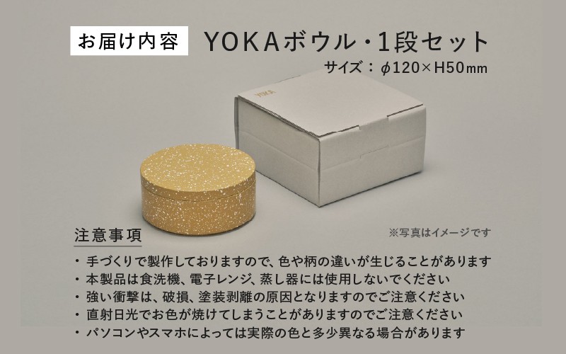 | 容量 | 【内容】 YOKAボウル・1段セット オリジナルボックス付 【色】 ・錆御納戸(さびおなんど) ・蕎麦切(そばぎり) ・桑染(くわぞめ) ・紅梅(こうばい) ※4色の中からお選び頂けます。 【サイズ】 φ120mm×50mm(蓋+器1つ) 【材質】 木質樹脂・ウレタン塗装 【注意事項】 ・一点一点手づくりで製作しておりますので、色や柄の違いが生じることがあります。予めご了承ください。 ・本製品は食洗機、電子レンジ、蒸し器には使用しないでください。 ・強い衝撃は、破損、塗装剥離の原因となりますのでご注意ください。 ・直射日光でお色が焼けてしまうことがありますのでご注意ください。 ・パソコンやスマホによっては実際の色と多少異なる場合があります。 |