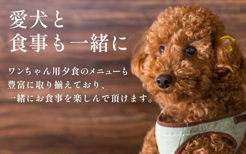 ワンちゃん用夕食のメニューも豊富に取り揃えておりますので、一緒にお食事を楽しんで頂けます。