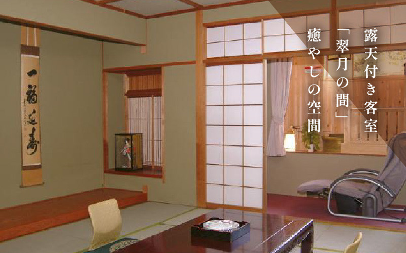標準的なお部屋(和室)と、庭園内独立1戸建て 特別室 離れ「風月庵」、本館内準特別室 露天風呂付き客室「翠月の間」がございます。
