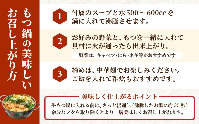 厳選した新鮮なモツとスープがセットとなっておりますので、野菜だけご用意いただければ、簡単にお召し上がりいただけるようにしてあります。