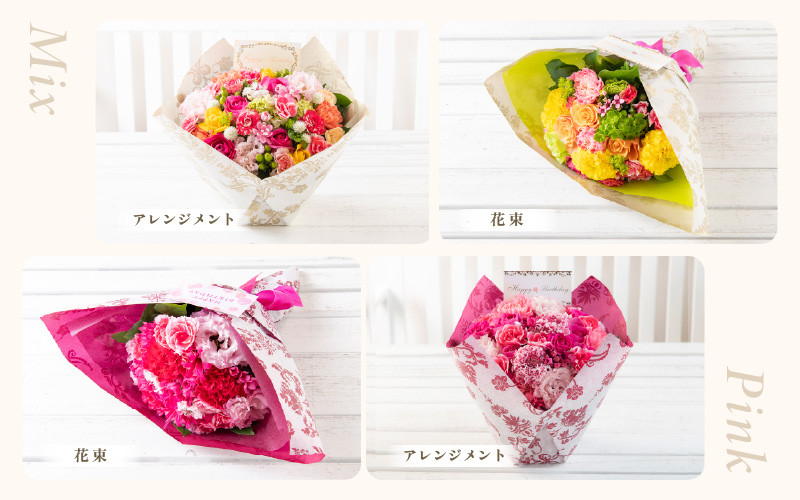 4種類のカラーから花束とアレンジを選んでいただけます。