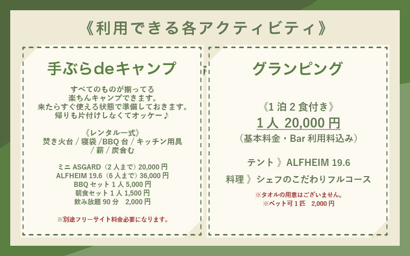 グランピング・キャンプ・デイキャンプ・各種お食事やアクティビティにご利用いただけます。