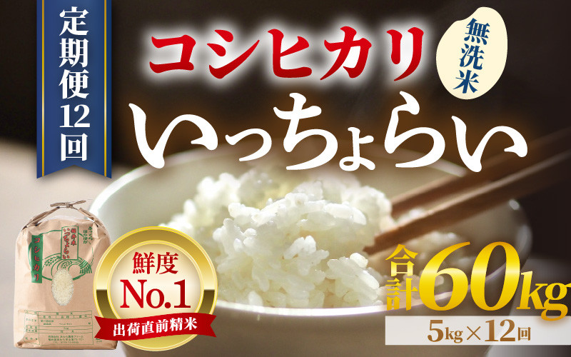 チョイスPayポイントと交換できる品 発送直前精米で鮮度抜群!粒感際立つ美味しい高品質米をお届け! 【令和7年産・新米】【一等米】《定期便12回》いっちょらい 無洗米 5kg × 12回(計60kg) / 福井県産 ブランド米 コシヒカリ ご飯 白米 新鮮 大賞 受賞 [aw012-m004]