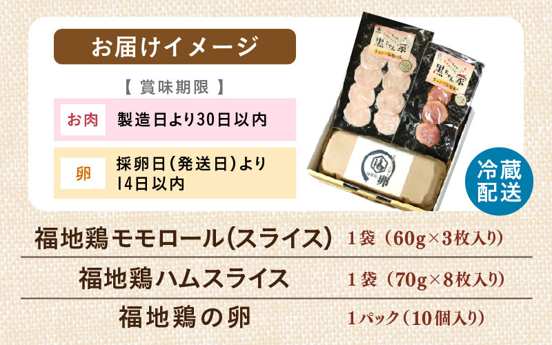 チョイスPayポイントと交換できる品 新鮮、安全、安心な福地鶏のお肉と卵のセット! 福井ブランド「福地鶏」セット(モモロール・ハムスライス・卵)お肉も卵も堪能できる! [aw036-a005]