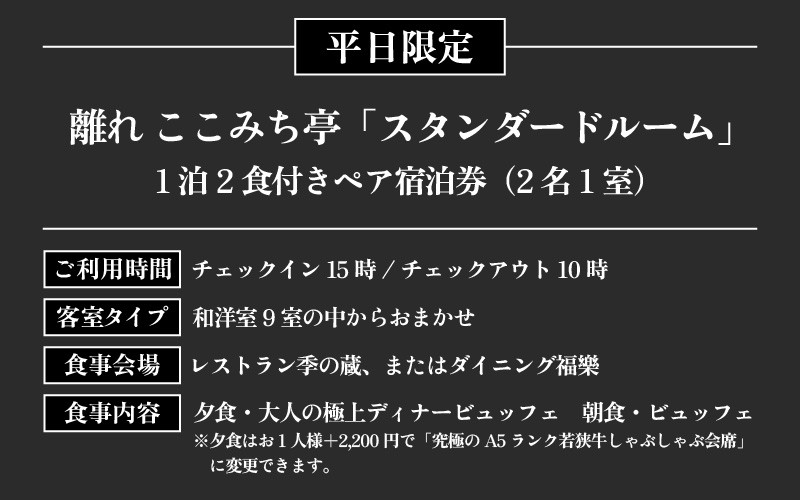 | 容量 | 1泊2食付きペア宿泊券(2名1室) 平日限定 和洋室(ツインベッド+畳リビングまたは、ツイン+縁側)の中からおまかせ *ご要約時にご確認ください。 |