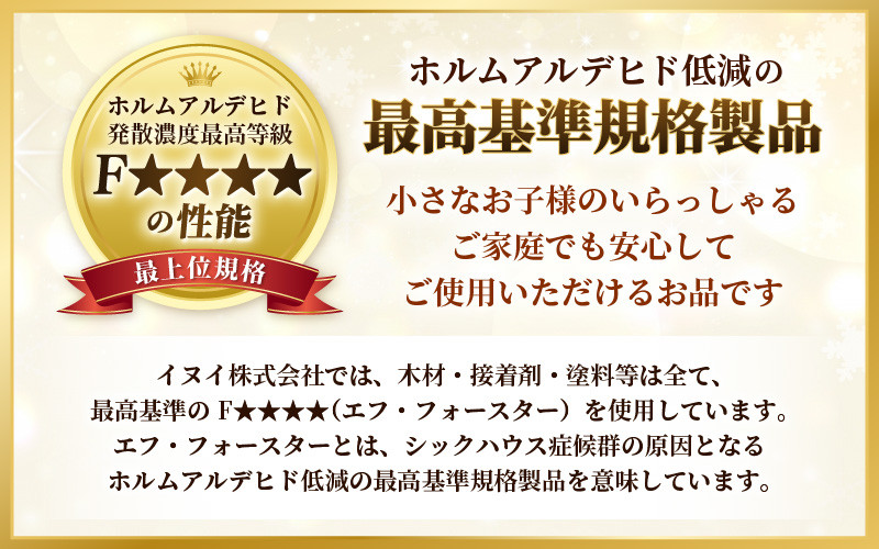 イヌイ株式会社では、木材・接着剤・塗装等は全て最高基準のF☆☆☆☆(エフ・フォースター)を使用しています。エフ・フォースターとは、シックハウス症候群の原因となるホルムアルデヒド低減の最高基準規格製品を意味しています。建材や接着剤などに含まれているホルムアルデヒドという化学物質は、少しずつ室内に放散され目や気道に刺激を感じることがあります。