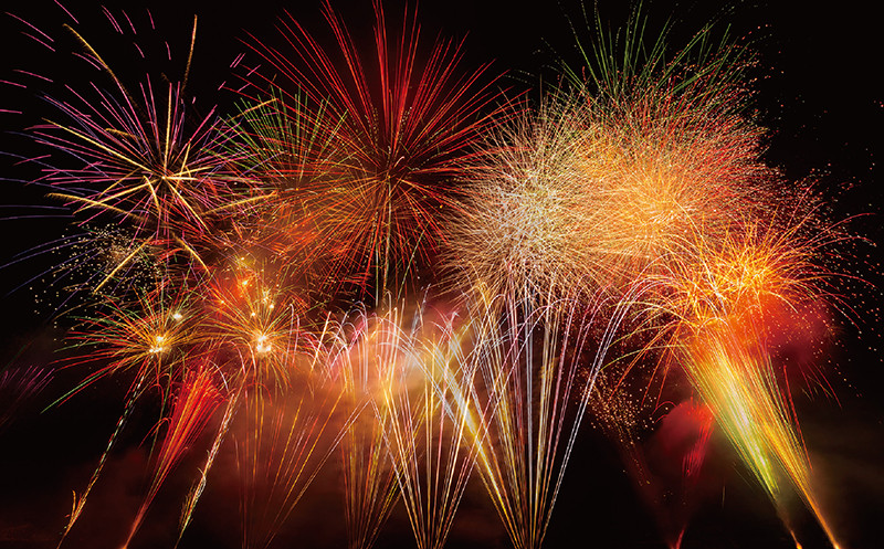 福井県越前市の夏の夜空を彩る花火大会。越前市の中心部を見下ろす、雄大な村国山をバックに花火が打ち上げられる。村国山を背景にしたロケーションは、花火の音が山に反響して大迫力。