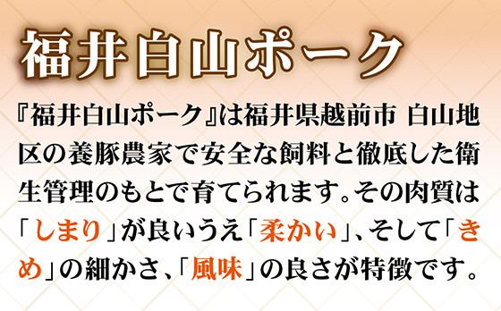 『福井白山ポーク』は福井県越前市の白山地区の養豚農家で安全な飼料と徹底した衛生管理のもとで育てられました。その肉質は「しまり」が良いうえ「柔かい」、そして「きめ」の細かさ、風味の良さが特徴です。脂身がさっぱりしていて、クセが少なく、お子様にも食べやすいと評判です。