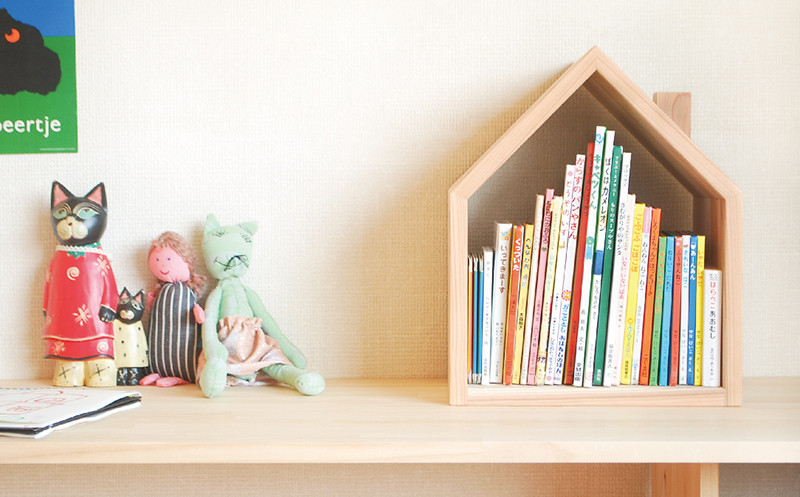 背の低い絵本から高い絵本へ。きれいに並べるとおうちの屋根の形とぴったり。