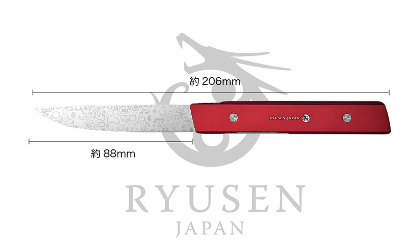 | 容量 | 【 商品仕様:ステーキナイフ 】 ●刃長:約 95mm(刃渡り:約88mm) ●全長:クローズ時:約 115mm / オープン時:約206mm ●刃幅:約 15mm ●重量:約 78g ●材質:VG10 / VG2(70層 ダマスカス鋼 ) ●ハンドル:アルミニウム(アルマイト加工) ●カラー:レッド ●付属品:牛革ケース(赤ステッチ) |