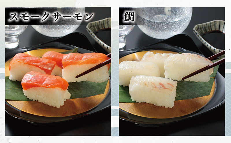 | 容量 | ・甘えび寿し ・うなぎ寿し ・鯖寿し ・焼鯖寿し ・スモークサーモントラウト寿し ・かに寿し ・鯛寿し ・えんがわ寿し ×各1本 重量:1箱 1320g |