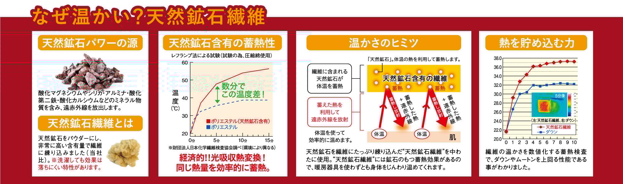 ◆天然鉱石繊維の蓄熱力はダウン・ムートンよりも上回ります。