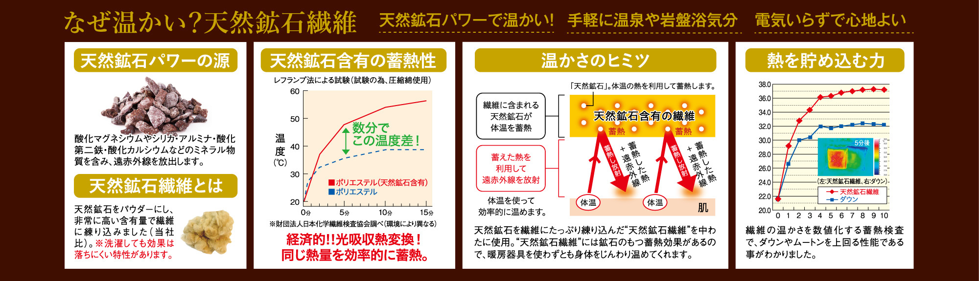 ◆天然鉱石繊維の蓄熱力はダウン・ムートンよりも上回ります。