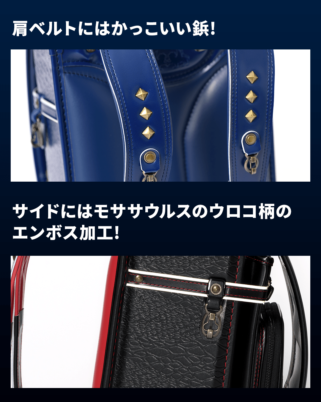 肩ベルトにはモササウルスのとげとげを表した鋲。