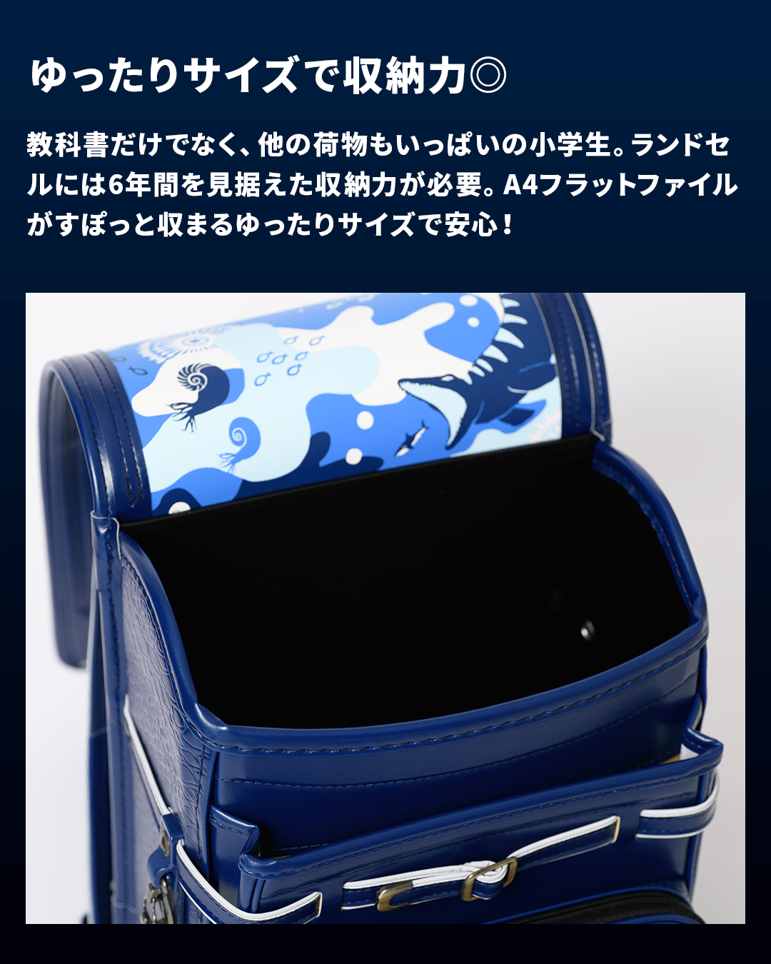 かぶせ裏はランドセルカラーに応じたカラーのモササウルス、アンモナイトのカモフラージュ柄デザイン。