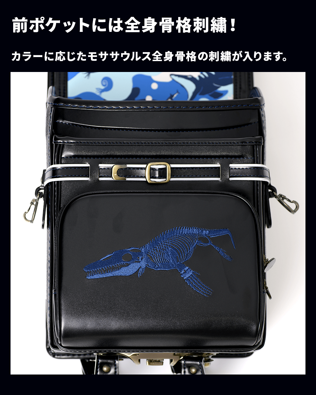 かぶせを開けると現れる、迫力のあるモササウルスの刺繍や反射材でキラリと反射するアンモナイトをはじめ
