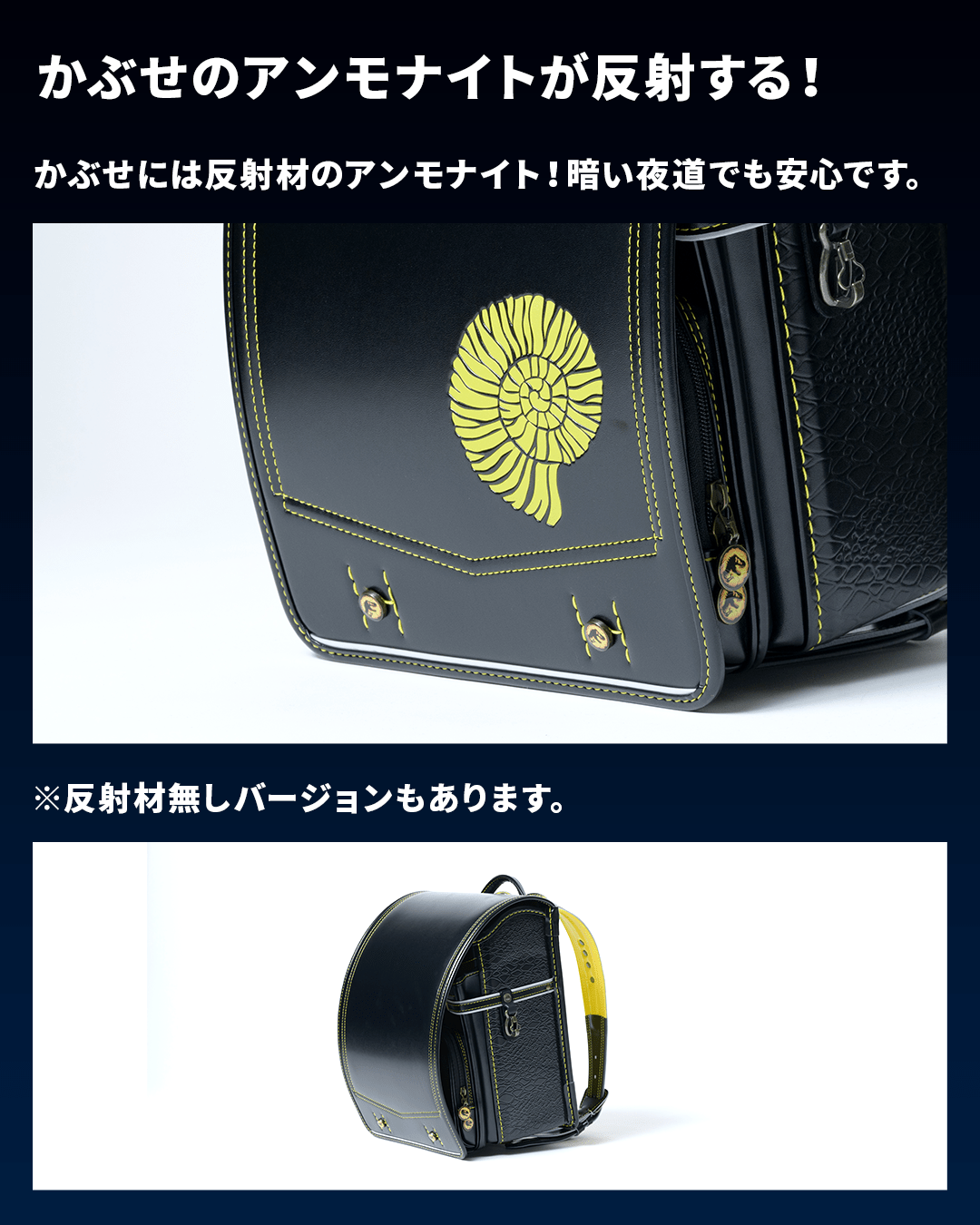 かぶせのアンモナイトに反射材を採用!お子さまの安全を守ります。