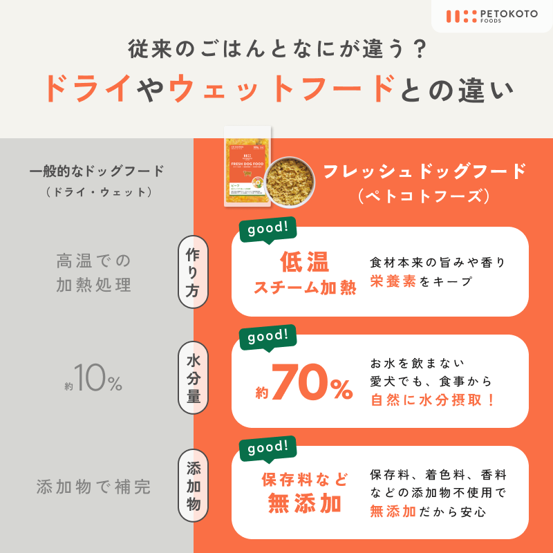 従来のドライ加工が施されたドライフードやレトルト加工が施されたウェットフードではありません。新鮮なお肉や野菜を使ってワンちゃんが食べやすい形に一つ一つ調理することで、香りや彩り・栄養価の損失を抑えた、正真正銘の美味しい"手作りのご飯"です。95%のワンちゃんが食いつきが改善したと回答いただいています。