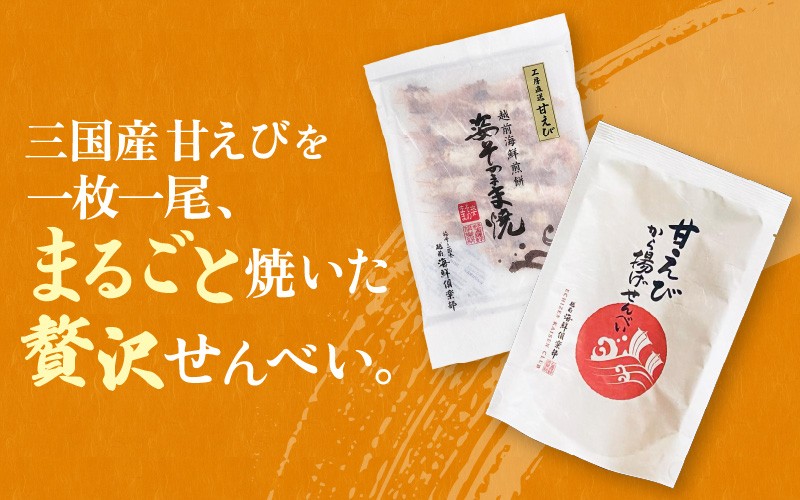 三国港で水揚げされた新鮮な甘えびを頭から尾まで丸ごと一匹贅沢に使用しました! 【家庭用】 極上甘えび姿そのまま焼 & 越前甘えびから揚げせんべいセット [A-7806]
