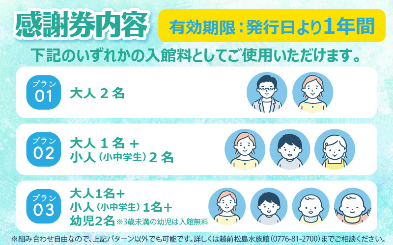 | 容量 | ご入館チケット(大人2名、大人1名小人2名、大人1名小人1名幼児2名から選べます) *3歳未満の幼児は入館無料 *感謝券には旅費等を含みません |