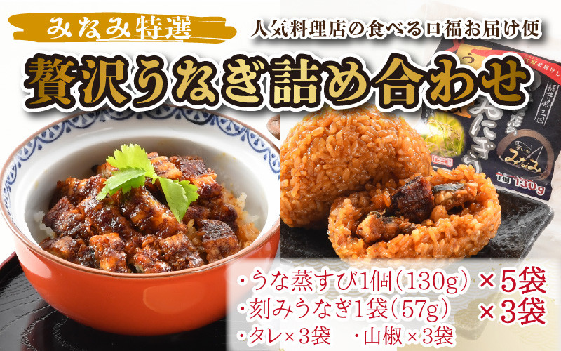 うなぎをたっぷり楽しみたい方や家族の多いご家庭にはうな蒸すび5個と刻みうなぎが3袋入った「みなみ特選贅沢うなぎ詰め合わせ」がおすすめです!
