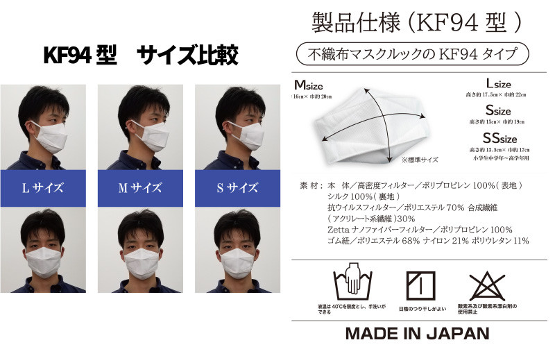 | 容量 | KF型 見た目不織布 ナノシルクマスク SSサイズ 1枚 ■サイズ マスク形状:不織布KF94型 SSサイズ:高さ 約14cm × 巾 約17cm (Mサイズが市販されている使い捨てマスクの普通サイズとなります) ※7色からお選びいただけます。 |