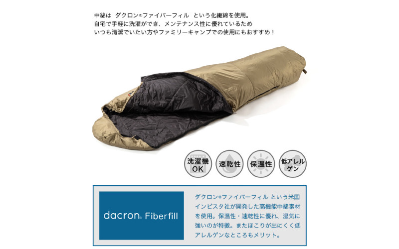 (※ダクロン®は米国インビスタ社が開発した高機能中綿素材)また、ダウンほどコンパクト性はないが、湿気に強く乾きが速いという、化繊シュラフの特徴があります。
