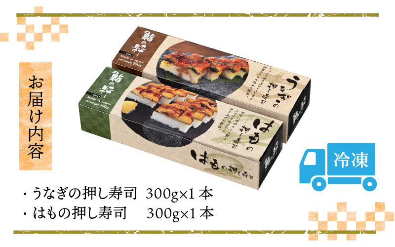 じっくり焼き上げたうなぎと、丁寧に骨切りした はもをふっくら焼き上げ、福井産あきさかりを使用した押し寿司の2本セット。