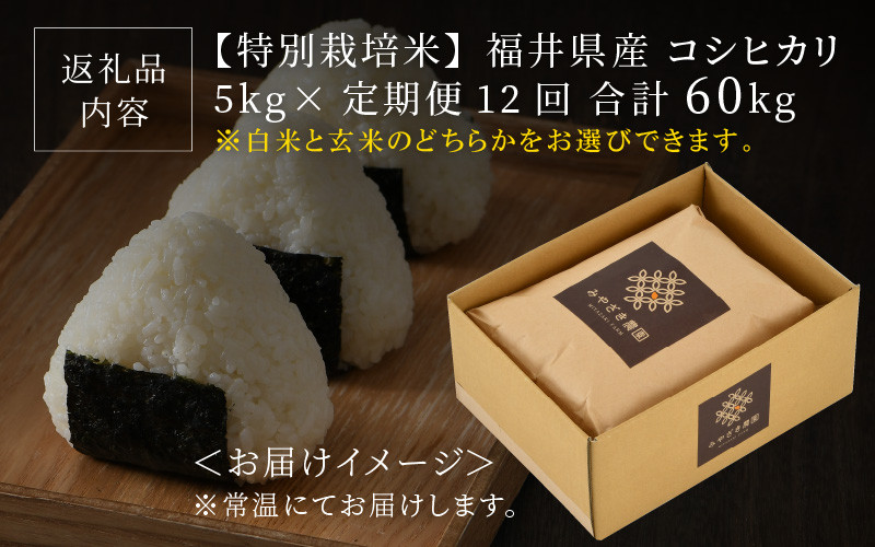 | 容量 | 特別栽培米 コシヒカリ (5kg×1) × 12か月 ※玄米または白米かをお選びできます。(いずれかを12か月連続) |