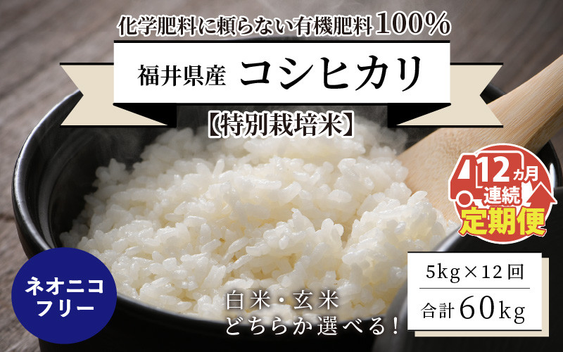 【先行予約】【令和8年産・新米】【12ヶ月連続お届け】【特別栽培米】福井県産 コシヒカリ 5kg ~化学肥料にたよらない有機肥料100%~ ネオニコフリー(白米)【2026年10月以降順次発送予定】【 白米 お米 ごはん ブランド米 こしひかり 5キロ 産地直送 定期便 お楽しみ ふるさと納税米 】 [N-13401_01]