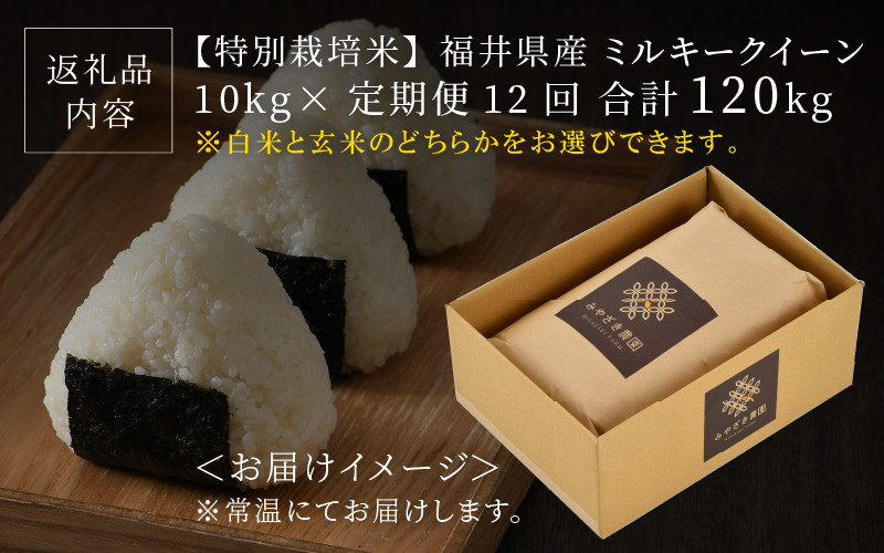農薬を50%以上減らし、有機肥料100%で作った特別栽培米 【先行予約】 【令和8年産・新米】 【12ヶ月連続お届け】【特別栽培米】福井県産 ミルキークイーン10kg×12回 計120kg ~化学肥料にたよらない100%の有機肥料~ ネオニコフリー 【2026年10月以降順次発送予定】【 白米 玄米 お米 ごはん 10キロ 産地直送 定期便 お楽しみ ふるさと納税米 】 [P-13402]