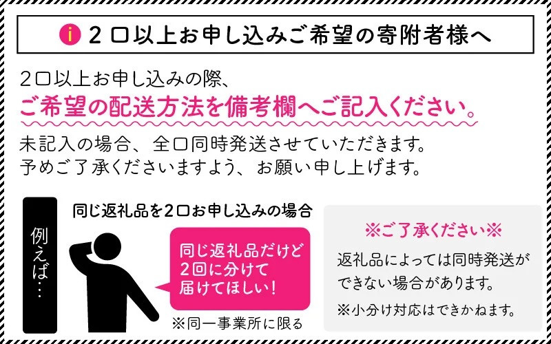 ご入金月の翌月より2ヶ月連続でお届け ※発送について該当月の中旬~下旬になる場合がございます。予めご了承ください。 ※長期ご不在の場合、お申し込み時【備考欄】に「不在期間〇〇/〇〇~〇〇/〇〇」とご記入ください。 ※長期ご不在や住所の誤り等、寄附者様のご都合により、返礼品をお受け取りいただけなかった場合、返礼品の再発送はいたしかねます。 ※商品出荷時「出荷のお知らせ」メールをお送りいたします。 ※ご注文殺到時、お届けに時間がかかる場合がございます。 誠に勝手ではございますが、あらかじめご了承ください。 |