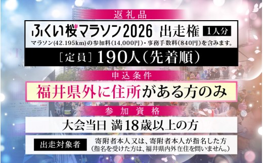 容量 | 【返礼品】「ふくい桜マラソン 2026」のマラソン(42.195km)への出走権(1人分) ・参加料(14,000円)、事務手数料(840円)を含む 【定員】190人(先着順) ※寄附者は、福井県外に住所のある方 ※出走対象者は、寄附者本人又は、寄附者本人から指名を受けられた方(指名を受けた方は福井県内外在住を問いません。) 【参加資格】大会当日に満18歳以上の方 |