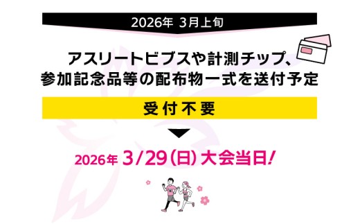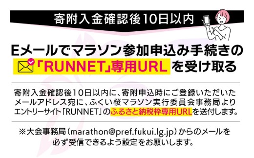 ・寄附のご入金確認後、ふくい桜マラソン実行委員会事務局から、10日以内に、Eメールで参加申し込み手続きをご案内します。 ・メールに添付されたエントリーサイト「RUNNET」の専用URLから申し込みいただきます。(参加料、事務手数料無料) ⇒出走権を譲る場合は、寄附者から指名された方ご本人が「RUNNET」でエントリーしてください。(「RUNNET」でのエントリー完了後の変更は一切できません) ※大会事務局(marathon@pref.fukui.lg.jp)からのメールを必ず受信できるように設定をお願いします。 ※寄附者本人に代わって参加資格を満たす方が出走する場合は、あらかじめ出走者の了承を得てください。 ※専用URLからの申し込みにあたっては、「RUNNET」の会員登録(無料)が必要です。 ・2026年3月上旬にアスリートビブスや計測チップ、参加記念品等の配布物一式を送付予定 |