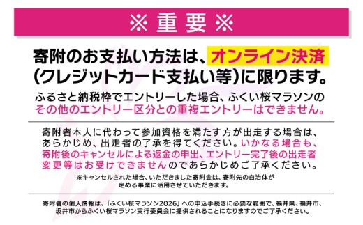 ●寄附者の個人情報は、「ふくい桜マラソン2026」への申込手続に必要な範囲で、福井県、福井市、坂井市から、ふくい桜マラソン実行委員会に提供されることになりますのでご了承ください。