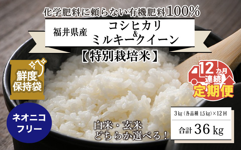 無化学肥料で作った安心・安全・高品質の特別栽培米! 【先行予約】 【令和8年産・新米】 【12ヶ月連続お届け】【特別栽培米】福井県産 コシヒカリ ミルキークイーン 1.5kg 各1袋 計3kg ~化学肥料にたよらない100%の有機肥料~ ネオニコフリー スタンドパック【保存に便利】【2026年10月以降順次発送予定】 [L-13403]