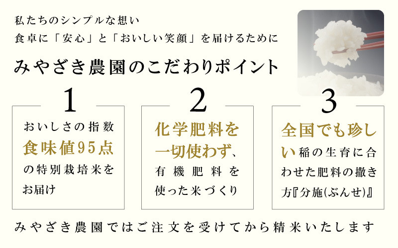 みやざき農園のコシヒカリとミルキークイーンは、 おいしさの指数である食味値 95 点の良食味米です。