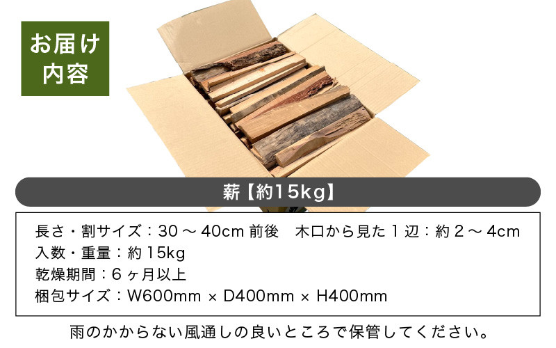 | 容量 | ■長さ・割サイズ:30~40cm前後 木口から見た1辺約2~4cm ■入数・重量:約15kg ■乾燥期間:6ヶ月以上 ■梱包サイズ:梱包サイズ:1箱 約15kg (W600mm × D400mm × H400mm)×1箱 ※木箱は付きませんのでご注意ください |