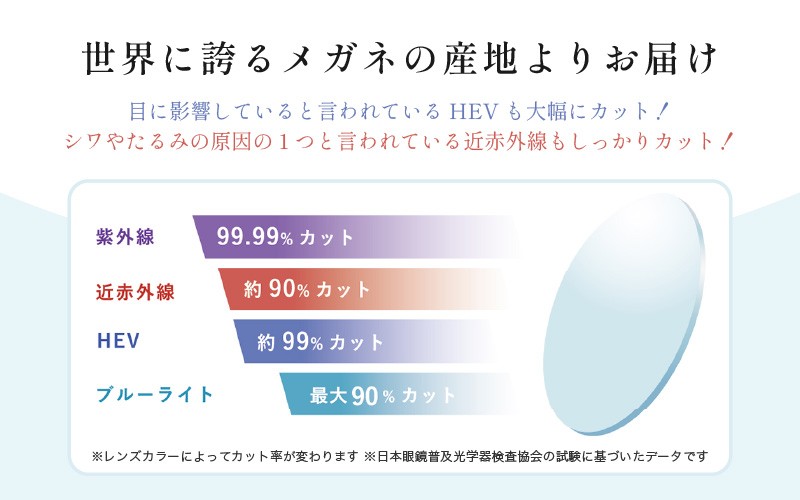 (紫外線カット率:99.99%/ブルーライトカット率最大70%/HEVカット率:約99%/近赤外線カット率:約90% ※日本眼鏡普及光学器検査協会の試験に基づいたデータです)