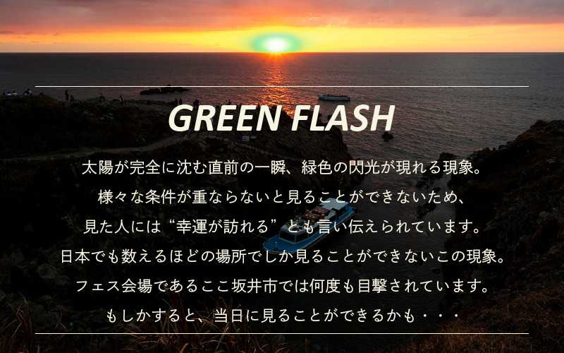 グリーンフラッシュのように、様々な音楽や人、時間、場所が揃うことで、その時にしか味わえない”瞬間”を楽しんでください。