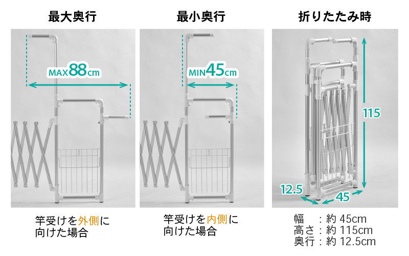 本体を好きな幅に広げ(67㎝~140㎝まで)、竿をパチンとはめれば設置完了の簡単設計。