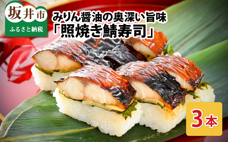 みりん醤油の奥深い旨味! みりん醤油の奥深い旨味がたまらない!「照焼き鯖寿司」 3本 【名物 ジューシー 焼きさば 押し寿司 さば寿司 テリヤキ 照り焼き すし こしひかり 贈答 ギフト お土産 大人気】 [A-0533]