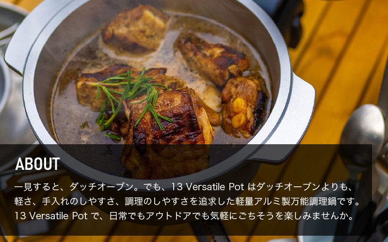 | 容量 | DVERG 13 Versatile Pot 1個 ■サイズ : (約)W237×D197×H133mm ■素材 : アルミ合金 ■重量 : (約)1680g ■生産国 : 日本 ■企画・デザイン:坂井市内 |