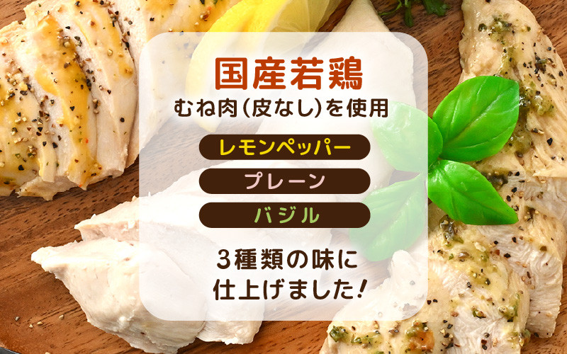 若鶏むね肉(国内産)を使い、プレーン味・バジル味・レモンペッパー味の3種類をセットにしました。